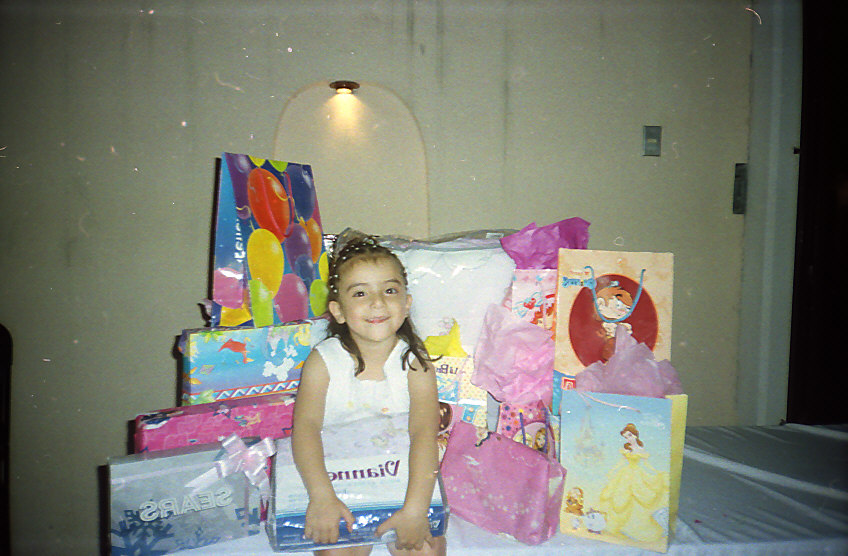 Se observa a una niña sonriente, sentada frente a una pila de regalos envueltos y bolsas de obsequio. La escena muestra un momento de celebración de cumpleaños, donde la niña parece feliz y rodeada de sus presentes. Los regalos varían en tamaño y diseño, indicando la diversidad de obsequios recibidos.