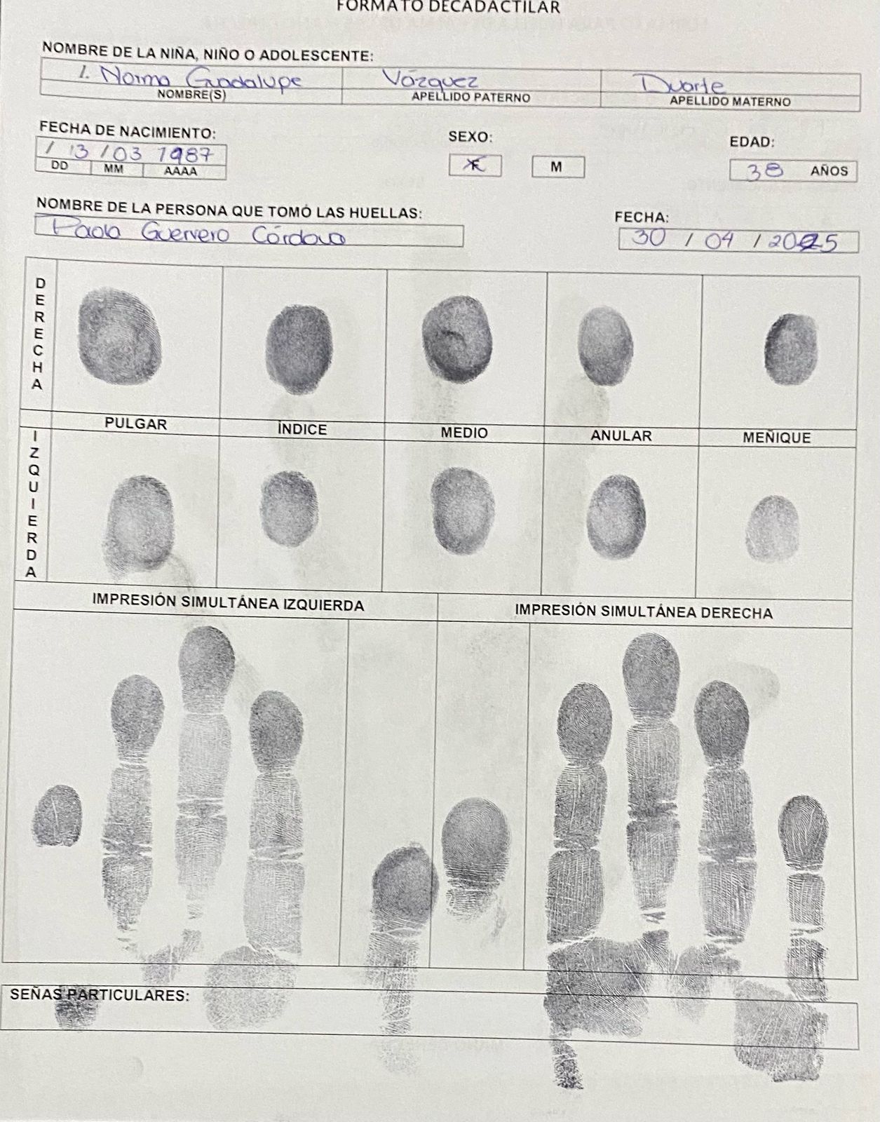 Ficha de huellas dactilares de la mano derecha e izquierda de Norma Guadalupe Vazquez Duarte