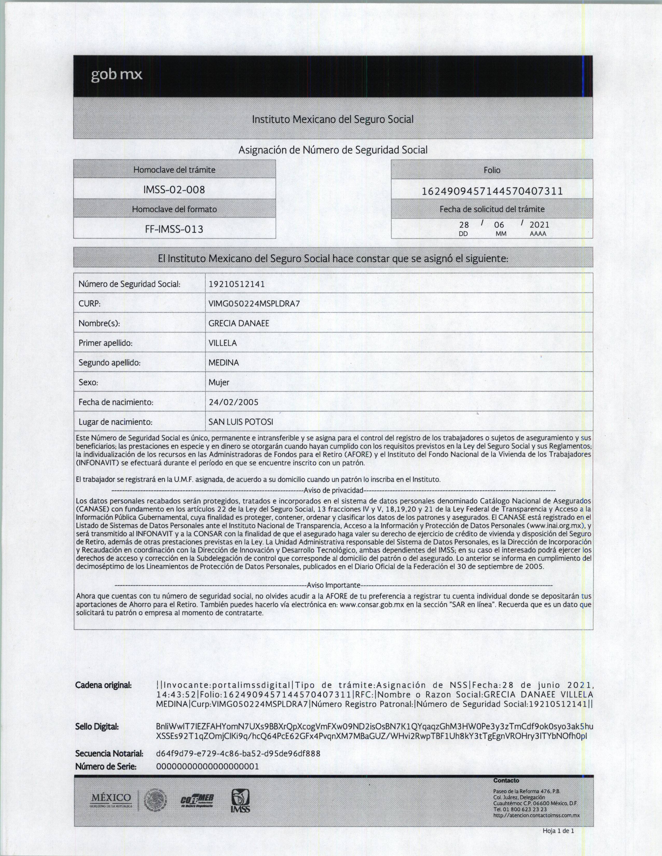 Documento oficial del IMSS que certifica la asignación del Número de Seguridad Social (NSS) a Grecia Danaee Villela Medina, incluyendo detalles como CURP, número de solicitud, QR para verificación y sello digital de seguridad