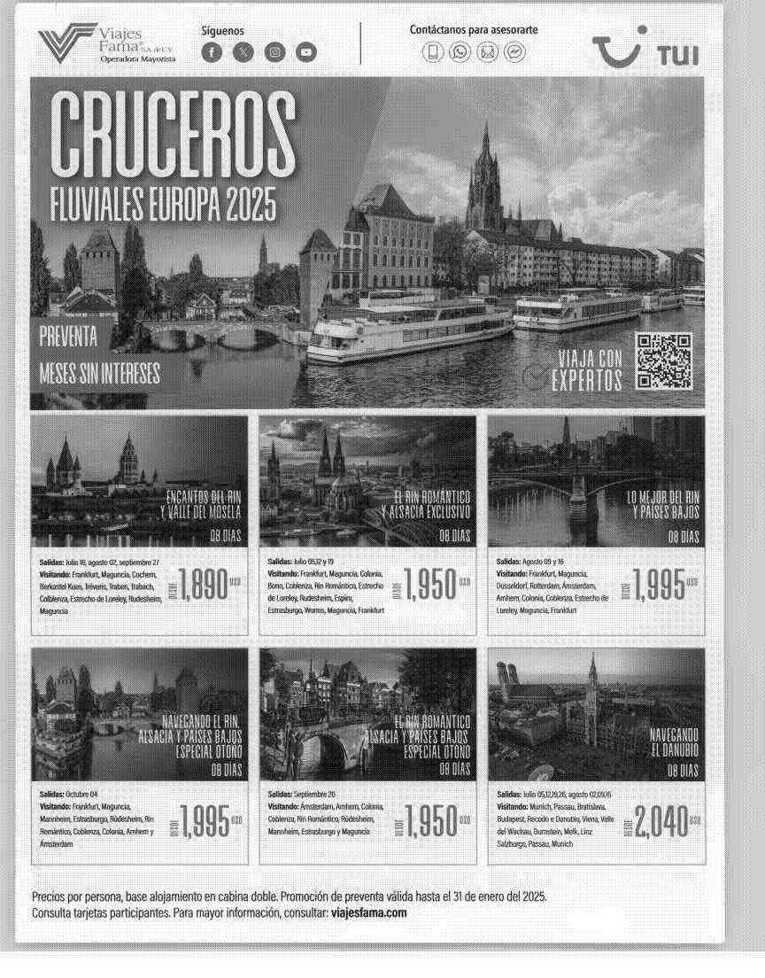 En la parte trasera del cartel nos muestra El segundo cartel promociona especÃficamente cruceros fluviales por Europa para el año 2025. La imagen principal muestra una ciudad europea con barcos crucero navegando por un rÃo, con una catedral gótica al fondo.