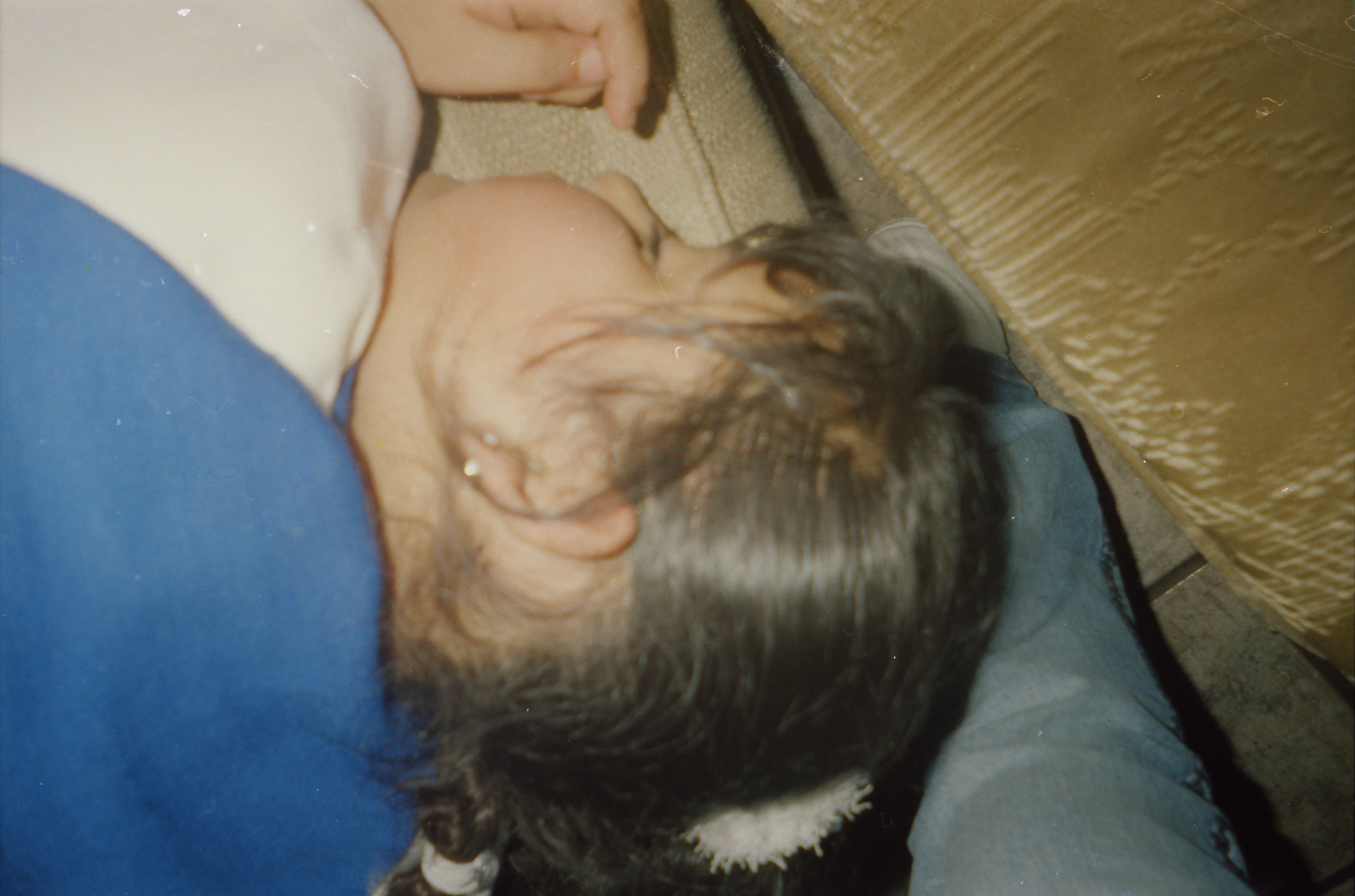 Fotografía en negativo; niña tomando una siesta en la sala de su casa después de la escuela.