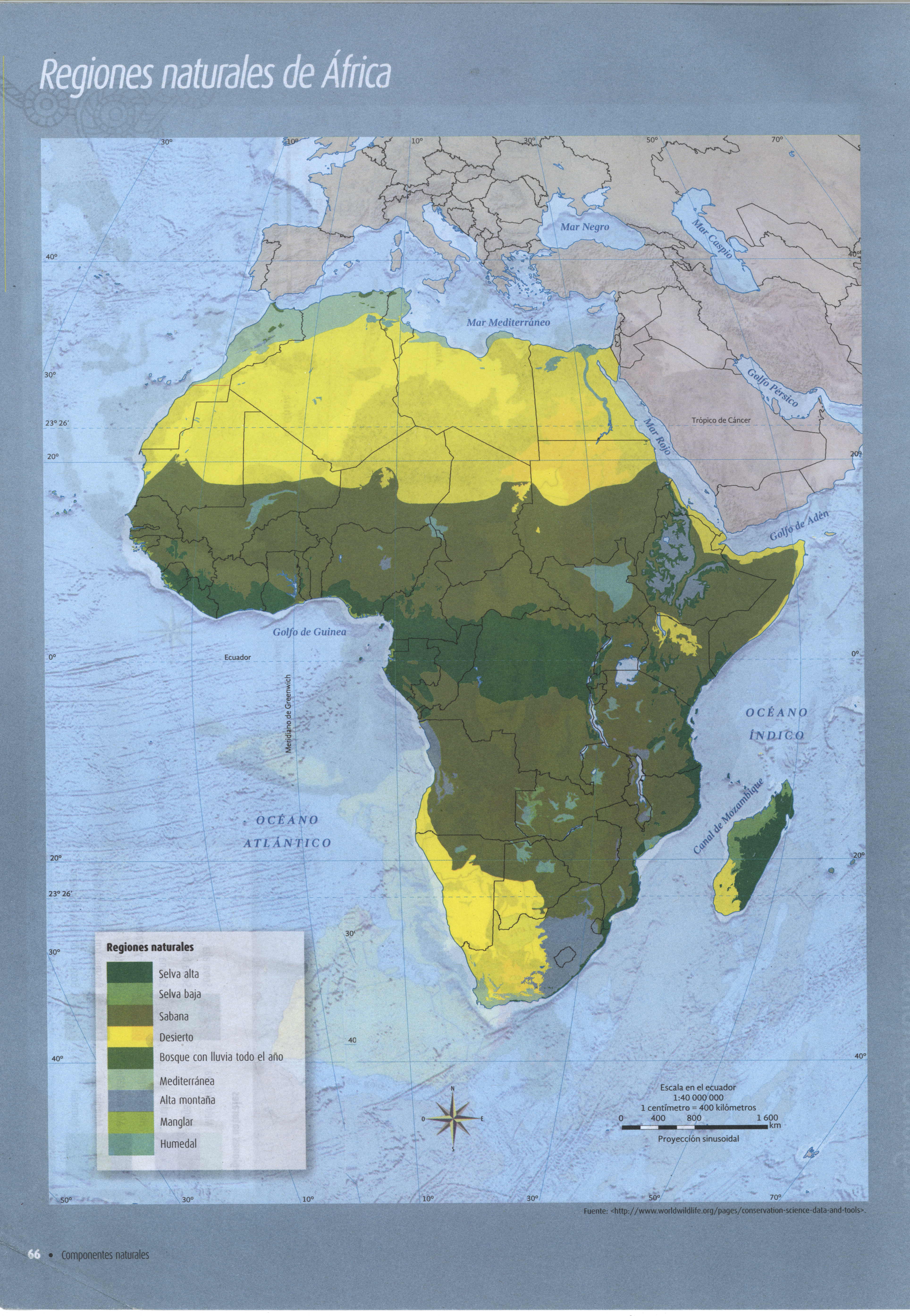 Este mapa es tomado de un libro Atlas de México de sexto grado de primaria en el que se aprecia por colores las regiones naturales de África.