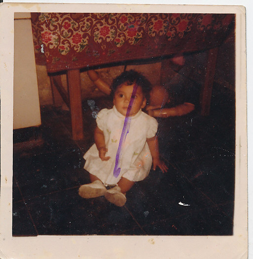Menor de edad que se encuentra sentada en el piso de una casa, con un vestido blanco y zapatos blancos.
