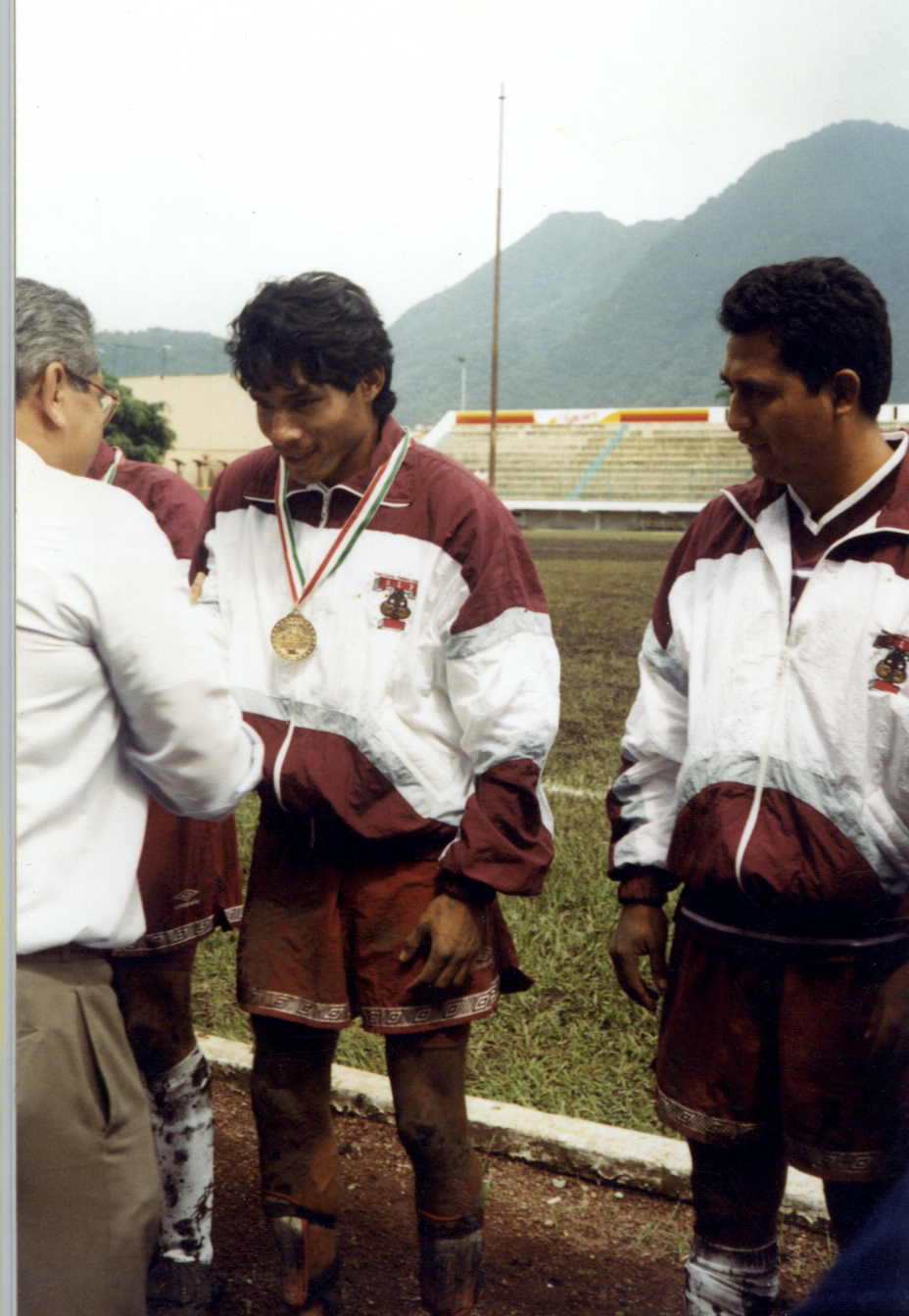 Captura del momento de reconocimiento a un jugador de fútbol, probablemente durante una ceremonia de premiación tras un torneo o campeonato. El gesto de entrega de la medalla celebra la dedicación, el esfuerzo y el logro deportivo, elementos que fortalecen la identidad y el sentido de comunidad. Esta fotografía documenta una tradición común en el deporte amateur y profesional.