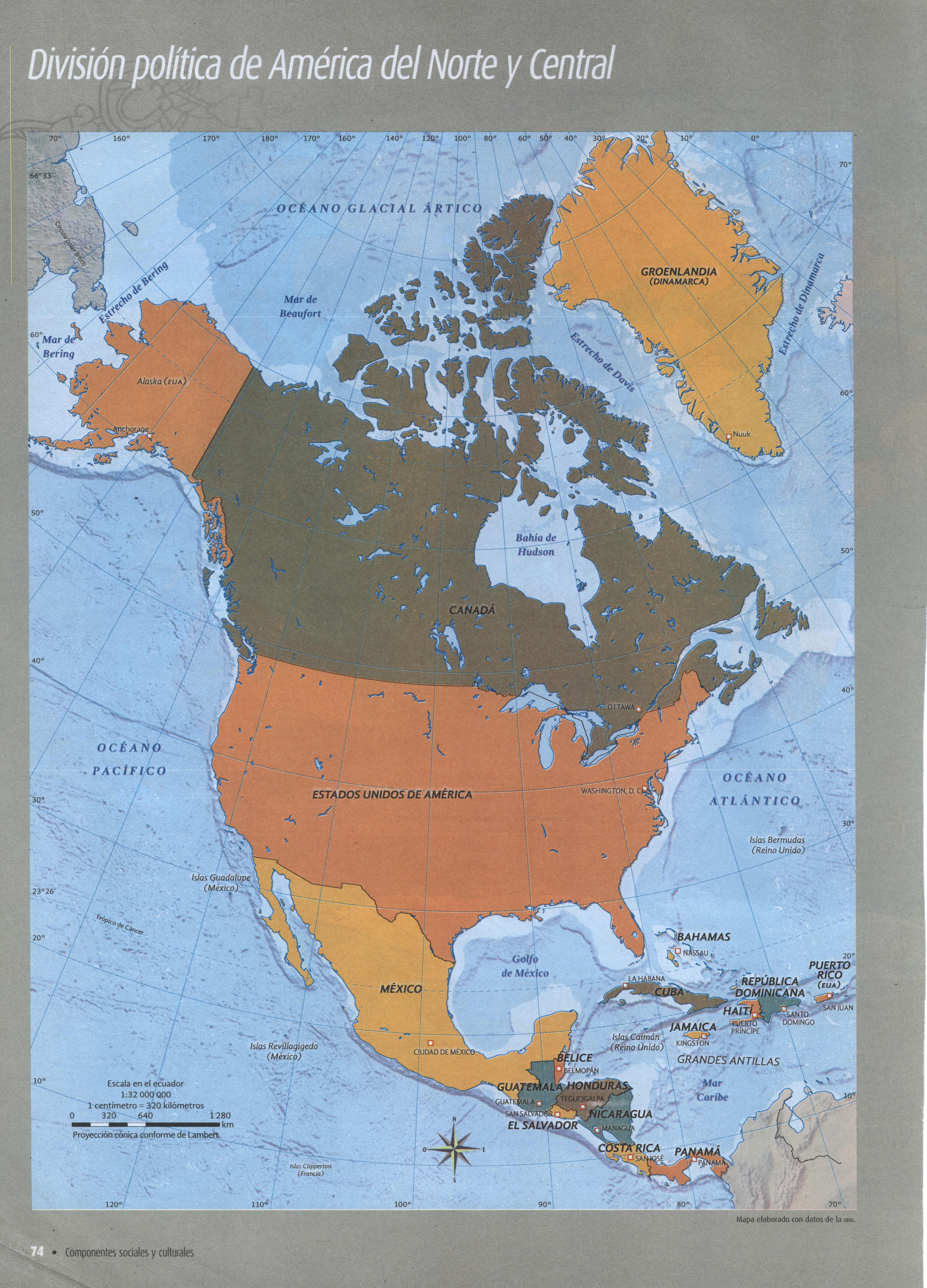 Este mapa es tomado de un libro Atlas de México de sexto grado de primaria en el que se aprecia por colores la división política de América del Norte y Central.