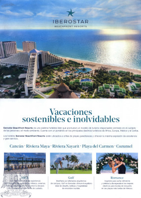 Publicidad de Iberostar Beachfront Resorts, destacando su enfoque en turismo responsable y sostenibilidad, con hoteles en África, Europa, México y el Caribe. Ofrecen experiencias únicas en playas exclusivas, con actividades como golf y bodas románticas.