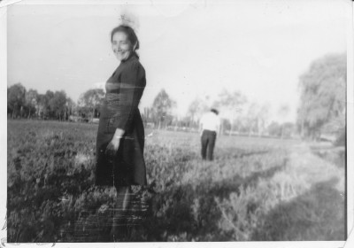 Fotografía en blanco y negro que captura una escena de trabajo en el campo. Se observan dos individuos, uno de pie y otro inclinado, realizando labores agrícolas en un entorno rural con árboles y cielo despejado. La imagen refleja aspectos de la vida campesina y el esfuerzo en la producción agrícola.