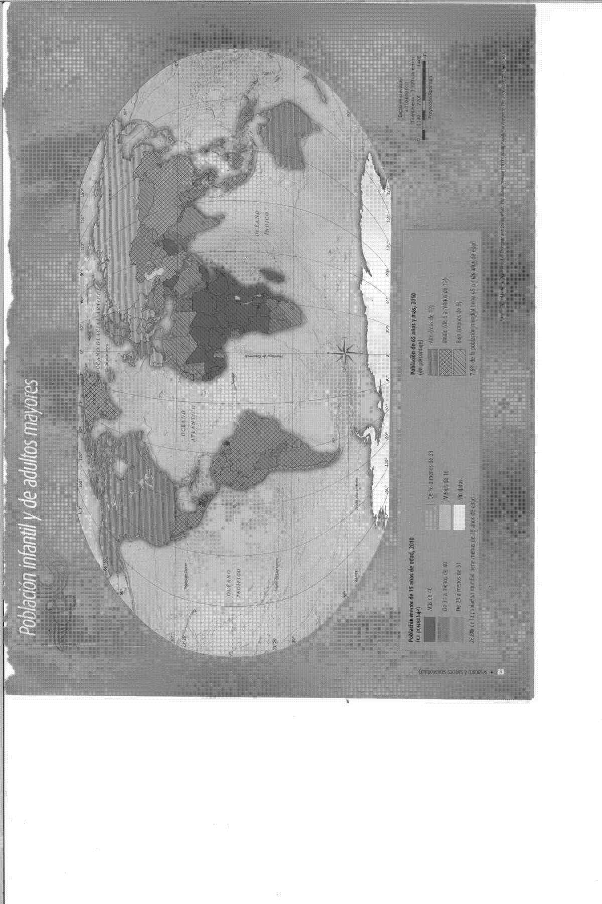 El mapa mantiene la misma proyección oval de Mollweide que permite visualizar todo el planeta en una sola imagen. Los continentes están claramente delineados y se pueden distinguir Europa, Asia, África, América del Norte, América del Sur, Oceanía y la Antártida. Una característica distintiva de este mapa es el uso de tramas diferentes para representar las distintas concentraciones o proporciones de población infantil y adulta mayor en diferentes regiones del mundo.