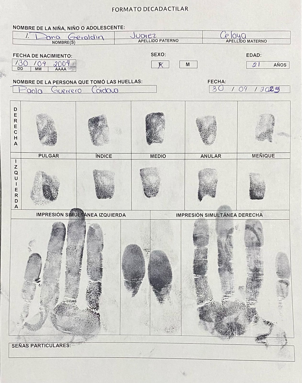 Ficha de huellas dactilares de la mano derecha e izquierda de Dana Geraldin Juarez Celaya