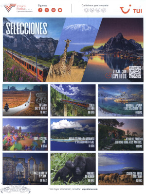 Publicidad de paquetes turísticos ofrecidos por Viajes El Corte Inglés y TUI, con diversas opciones de viaje a destinos con paisajes escénicos, vida salvaje y experiencias culturales. Presenta itinerarios con duración variable y detalles de los servicios incluidos.