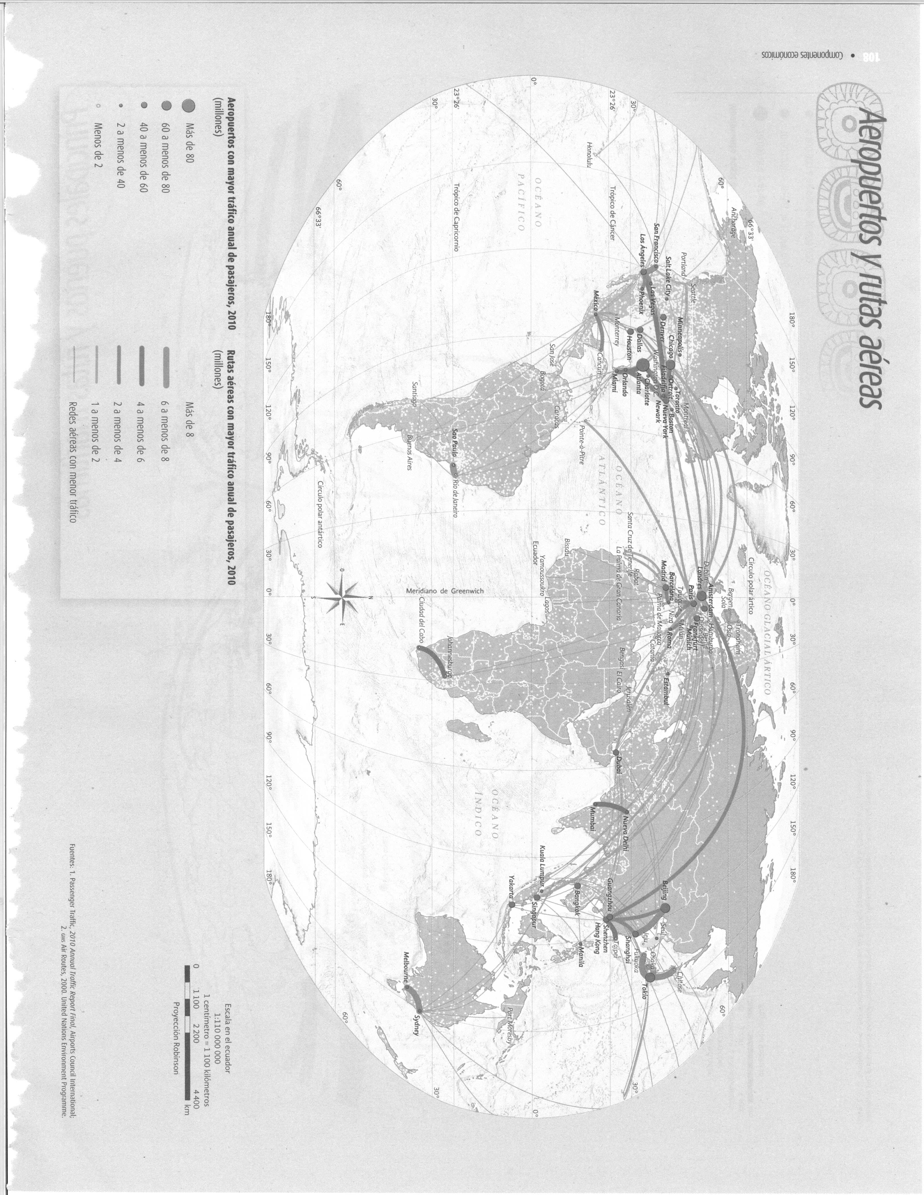 Es un mapa temático global titulado "Aeropuertos y rutas aéreas", el cual presenta una visión general del tráfico aéreo internacional en el año 2010, centrándose en los principales aeropuertos del mundo y sus rutas más transitadas.