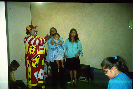 En esta imagen es del festejo de un cumpleaños en el cual hay payaso y está dando su show al lado de la festejada y sus papás.