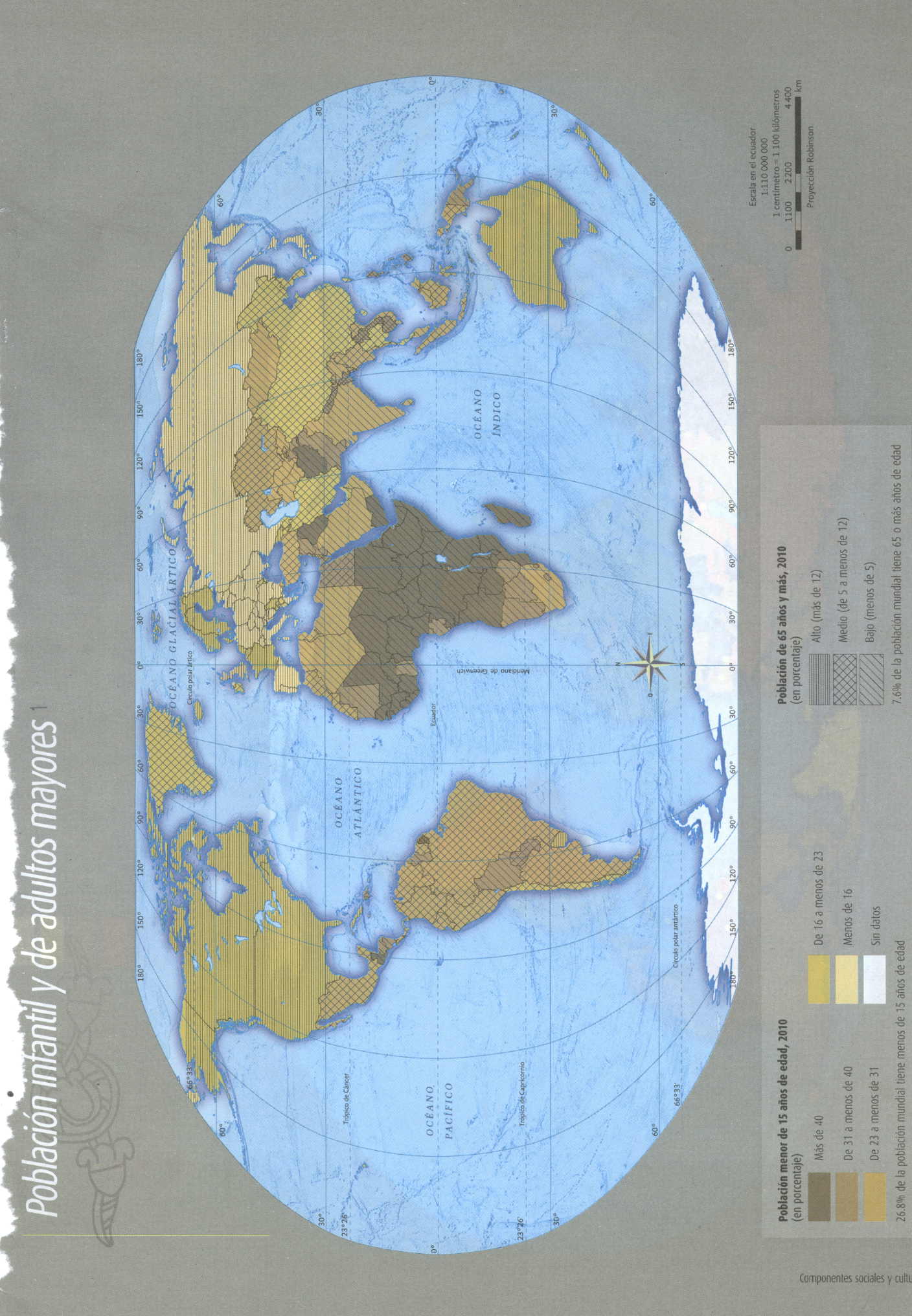 Representación cartográfica que muestra la distribución mundial de población infantil y adultos mayores, con fecha de 2010. El mapa incluye información técnica sobre la publicación en el año 2010 y escalas de clasificación demográfica con sus respectivas simbologías.