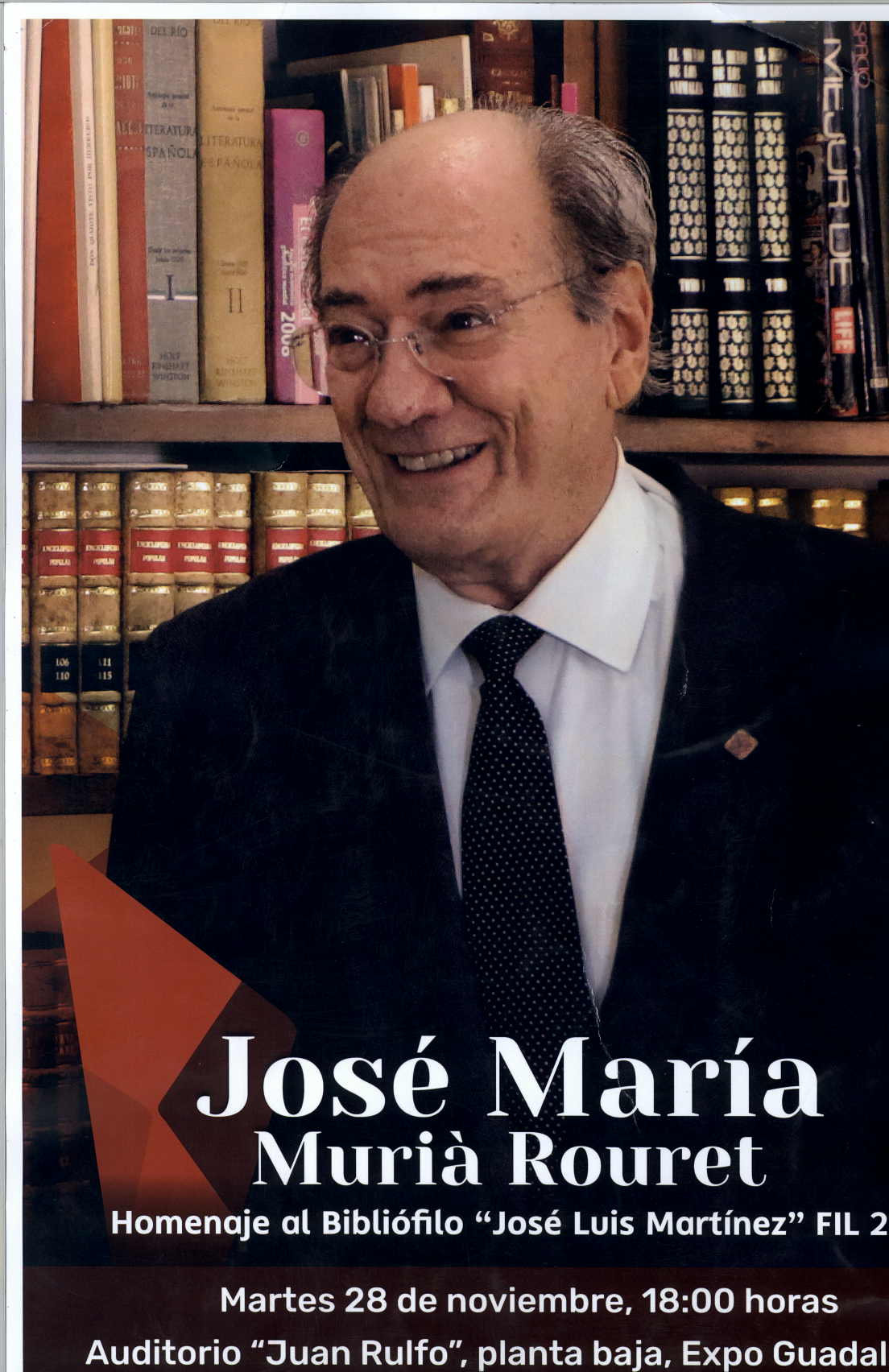 La imagen presenta un cartel sobrio que anuncia un homenaje póstumo al célebre bibliófilo José Luis Martínez, realizado en el marco de la Feria Internacional del Libro de Guadalajara (FIL).