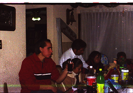 Esta imagen se aprecia una cena familiar. Se observan varias perosnas sentadas al rededor de una mesa, en donde se ven muchas botellas de refresco, agua y cacerola, se observan cinco personas tamando y queriendo agarrar cosas de las mesa.